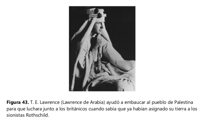 Durante la Primera Guerra Mundial, el Gobierno británico controlado por los Rothschild dijo a los árabes palestinos que si luchaban contra los turcos otomanos y los obligaban a abandonar Palestina serían premiados con un país independiente. El secretario británico de Asuntos Exteriores del momento era el iniciado de la sociedad secreta de los Rothschid, lord Balfour; sí, el mismo tipo que, en su carta dirigida a los Rothschild, había prometido el apoyo del Gobierno británico a la patria judía en Palestina. Los árabes aceptaron este trato y, con apoyo de un teniente coronel británico llamado Thomas Edward Lawrence —Lawrence de Arabia—, derrotaron al Imperio otomano. El premio de los árabes no fue, por supuesto, la independencia (figura 43). Gran Bretaña se apoderó de la administración de Palestina en espera de la llegada de los sionistas Rothschild. Engañaron a los árabes, tal y como admitió posteriormente Lawrence, y desde entonces los han seguido engañando. Todos estos «hojas de ruta» y «procesos de paz» han estado ideados para no llevar a ninguna parte. Su única función es mantener el statu quo hasta que los palestinos ya no estén. Los Rothschild tenían una única ambición cuando llegaron finalmente a Palestina tras la Segunda Guerra Mundial: llevarse a los palestinos de sus tierras y expandir constantemente las fronteras de Israel a través de la guerra y la intimidación. Desde el principio, la «patria judía» fue un feudo de los Rothschild dirigido por la red mundial de sociedades secretas de familias entrecruzadas, y la principal sociedad secreta involucrada se llama sionismo. Los Rothschild financiaron a los primeros pobladores europeos en Israel, manipularon los acontecimientos en Alemania que llevaron al terrible trato de los judíos y otros grupos y luego lo utilizaron de pretexto para alcanzar su objetivo a largo plazo, una fortaleza Rothschild-Illuminati en Palestina que utilizara a los judíos como pasto para encubrir lo que realmente estaba ocurriendo.